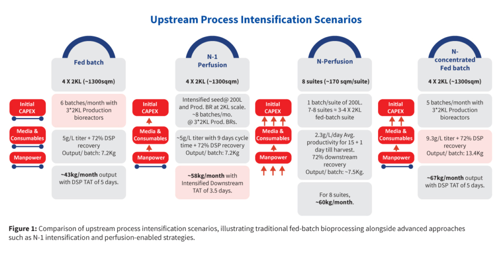 Industry-standard approaches to intensification typically involve trade-offs. Traditional fed-batch processes offer moderate titers (~4–6 g/L) and monthly outputs around 40-50 kg using 4 x 2kL reactors. Full-scale perfusion production boosts productivity further but demands substantial capital investment and staffing resources. N-1 perfusion can shorten seed train duration and modestly increase titer, but it introduces a slightly high media consumption and increases operational complexity. Concentrated fed-batch processes improve titers but require more media than N-1 perfusion (Figure 1). Each approach offered incremental gains—but also came with trade-offs in cost, complexity, or scale-up risk. So, the choice of intensification is very important to get a meaningful outcome.