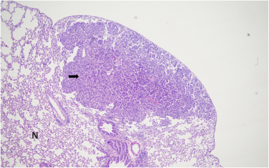 In contrast, bronchiolo-alveolar adenocarcinomas were less frequent. The current study reported an incidence of 4% in males, which was lower than the 7% observed in Central Institute for Experimental Animals (CIEA)