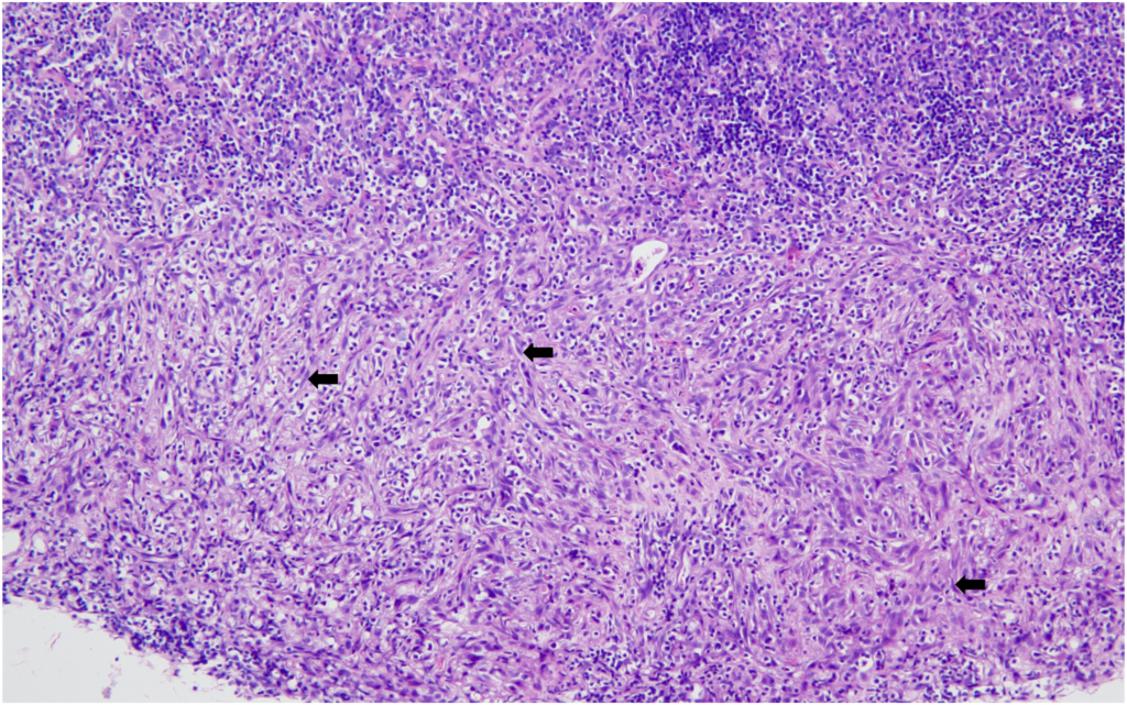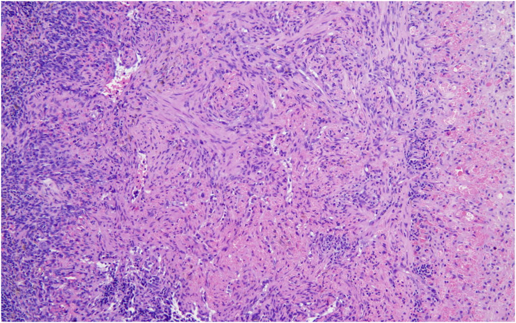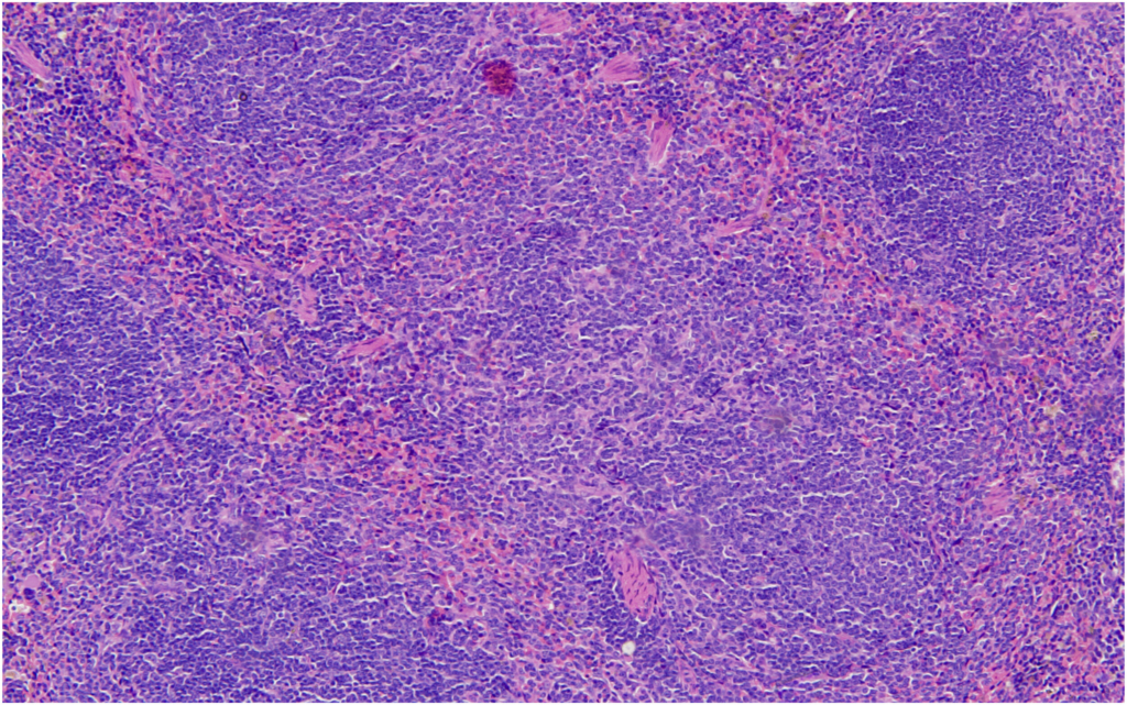 Hemangiosarcoma of the spleen was identified as the second most common spontaneous neoplasm in both male and female mice in the present study. The incidence was 2% in male mice and 4% in female mice, aligning closely with previously reported data. Historical data from Paranjpe et al documented slightly higher incidences of 3.66% and 3.87% in male mice and 3.66% and 3.76% in female mice, respectively. Similarly, Labcorp reported incidences of 3.8% in males and 3.5% in females, further supporting the consistency of this lesion across studies.