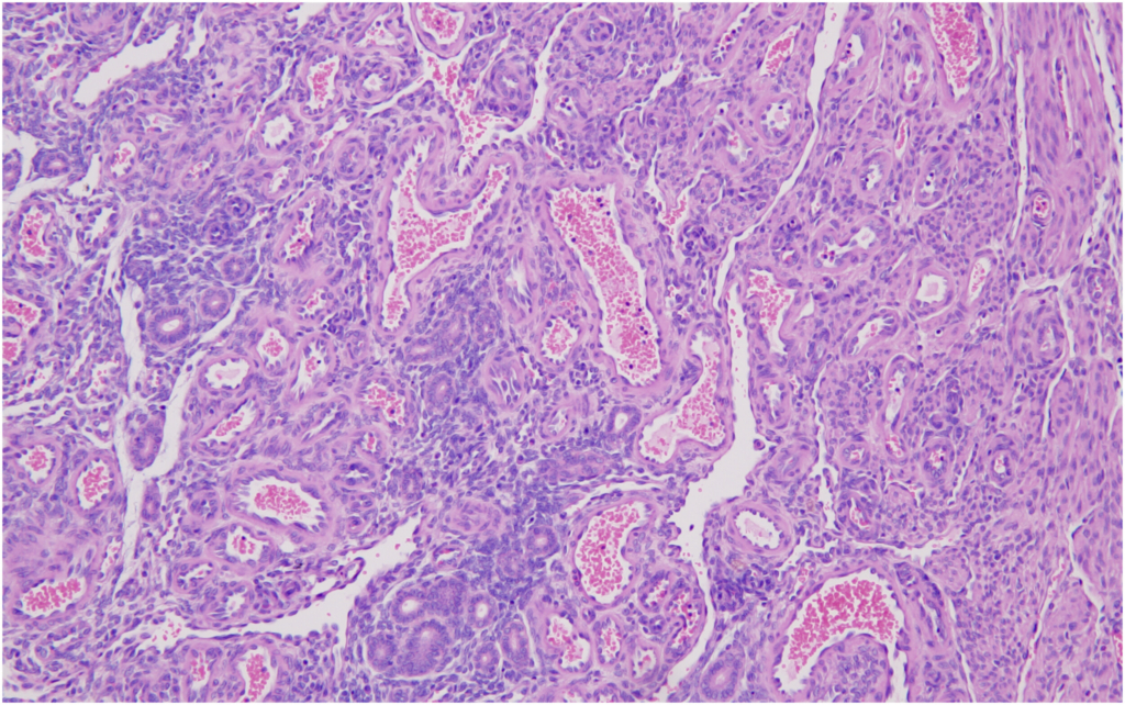 It is known that Tg.rasH2 mice also occasionally develop hemangiomas and hemangiosarcomas in organs other than the spleen. These tumors present grossly as blood-filled nodules or masses. The microscopic features of these hemangiosarcomas are very similar to the ones described for the spleen above. No hemangiomas were observed in any of the mice. Hemangiosarcoma was also observed in the testes/uterus, with an incidence of 2% each, while its average incidence in the referred publications was found to be lesser in males (0.7% and 0.22%, respectively) and somewhat variable in females (1.41% and 0.12%, respectively). However, it is worth noting that the two publications of Paranjpe et al also describe the “range” of % incidence of all tumors in the studies they used for creating their historical database, and the % range per study for hemangiosarcoma in testes was reported to be 0%–4% while that in the uterus was 0%–8% and 0%–4%.